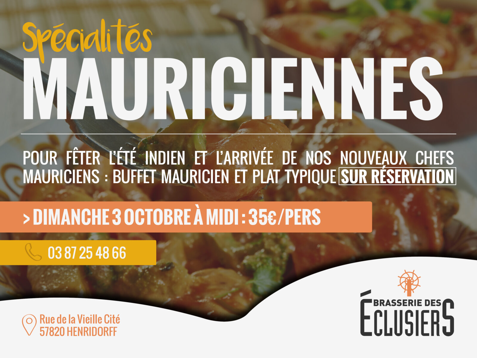 Loading ... visuel midi mauricien Rendez-vous dimanche 3 octobre à midi ! Buffet et plats typiques mauriciens pour fêter l’été indien et l’arrivée de nos 2 nouveaux chefs mauriciens ! 35 € / personne Sur réservation uniquement au 03 87 25 48 66 À très vite ! Brasserie des Eclusiers