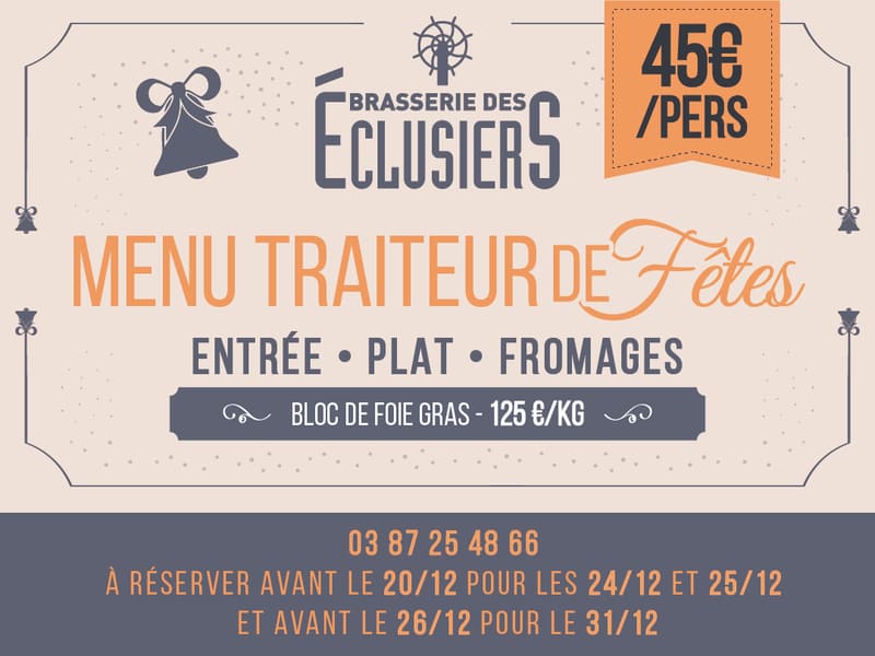Pour vos repas de Noël et Nouvel An, la Brasserie des Éclusiers vous propose un délicieux menu traiteur à 45 € / personne, pensé pour sublimer vos fêtes à la maison !